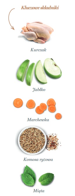 świeżo przygotowany kurczak 66%, cały zielony groszek, białko ziemniaczane, siemię lniane, drożdże (Saccharomyces cerevisiae), brązowy ryż, hydrolizat wątroby z kurczaka, olej z kurczaka (chroniony naturalnymi tokoferolami), minerały, białko grochu, tapioka, błonnik jabłkowy 4000 mg/kg, olej rybi (chroniony naturalnymi tokoferolami), odwodniona dynia, odwodniony jarmuż, kryl antarktyczny, glony morskie, spirulina, komosa ryżowa 1000 mg/kg, odwodniona marchew 1000 mg/kg, żurawina, cykoria (źródło FOS) 1000 mg/kg, hydrolizowana ściana komórkowa drożdży (źródło MOS) 1000 mg/kg, ekstrakt z mandarynki, mięta 500 mg/kg, imbir, rozmaryn.