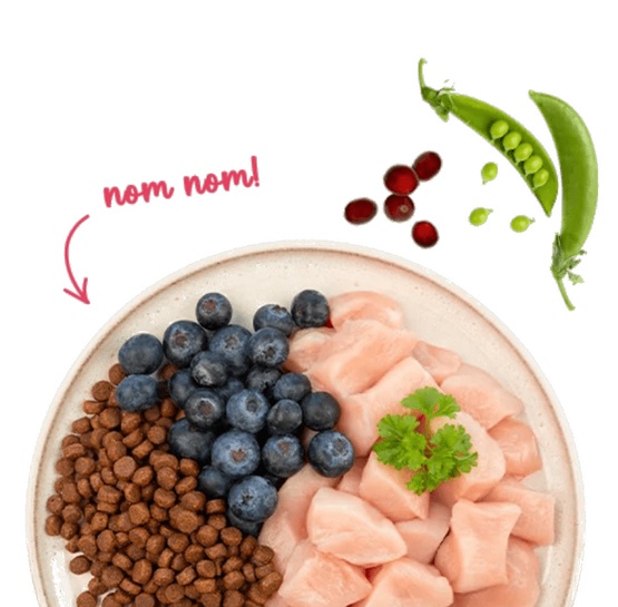 świeże mięso z kurczaka (25%), kukurydza, jęczmień, białko drobiowe (suszone), tłuszcz zwierzęcy, białko kukurydziane, hydrolizat białka, siemię lniane, węglan wapnia, ryż (1%), mączka wątrobowa, groch (suszony, 0,4%), borówka brusznica (suszona 0,1%), borówka (suszone, 0,1%), suszona pietruszka (0,1%), drożdże (suszone 0,1%), chlorek potasu, kwiaty nagietka (suszone, 0,05%).