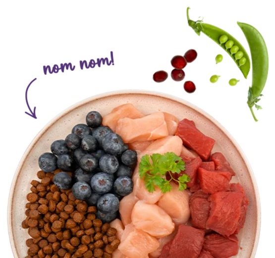 świeże mięso z kurczaka (20%), jęczmień, kukurydza, skwarki (suszone), tłuszcz zwierzęcy, mąka ryżowa, białko drobiowe (suszone), białko kukurydziane, białko strusia (suszone, 4%), groch (suszony, 4%), hydrolizat białka, suszona pulpa buraczana (bez cukru), skrobia grochowa, mączka wątrobowa, węglan wapnia, olej z łososia (0.5%), chlorek potasu, borówka brusznica (suszona 0.1%), jagody (suszone, 0.1%), suszona pietruszka (0.1%), drożdże (suszone, 0.1%), kwiaty nagietka (suszone, 0.05%).