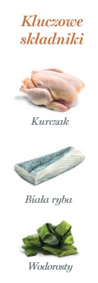 97,5% kurczak i biała ryba (74% świeży kurczak, 15,5% bulion z kurczaka, 7,5% świeża biała ryba, 0,5% olej rybny), minerały, wodorosty morskie 0,02%