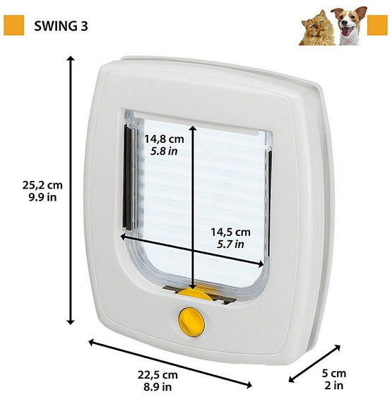 Dodatkowo modele Swing 5, 7 i 9 są wyposażone we wskaźnik przejścia, który pomoże ci błyskawicznie ocenić, gdzie znajduje się twoje zwierzę. Wskaźnik przejścia to "flaga" umieszczona na dnie klapy - będzie wskazywała kierunek, w którym twój pupil ostatnio przechodził.