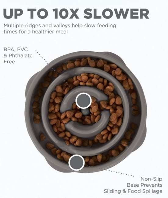 Wyposażona w specjalnie zaprojektowane labirynty i korytarze, miska Fun Feeder zmusza psy do powolniejszego jedzenia, co w efekcie przyczynia się do lepszego trawienia i satysfakcji. Jej antypoślizgowa podstawa utrzymuje miskę na miejscu, co zapobiega przesuwaniu się jej po podłodze i rozlewaniu jedzenia.