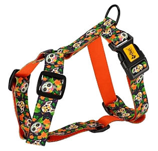 Szelki Guard z kolekcji City CHIAPAS wyróżniają się pięknym wzorem przypominającym pomarańczowe kwiaty aksamitek na ciemnogranatowej taśmie, inspirowanym tradycjami Dia de los Muertos. Dzięki temu nie tylko zwracają uwagę, ale również podkreślają indywidualny styl właściciela i jego pupila. Szelki są niezwykle wygodne, dzięki czemu Wasz pies będzie mógł cieszyć się swobodą ruchu, zarówno podczas codziennych spacerów, jak i podczas dłuższych wypraw.