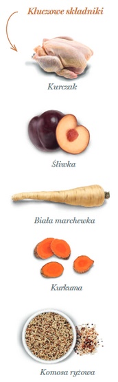 świeżo przygotowany kurczak 71% (używamy 140 kg świeżo przygotowanego kurczaka do wytworzenia 100 kg naszego produktu), pełnoziarnisty zielony groszek, pełnoziarnisty ryż, błonnik jabłkowy, hydrolizowana wątróbka z kurczaka, drożdże (Saccharomyces cerevisiae), białko ryżowe, minerały, olej rybny (konserwowany mieszanymi tokoferolami), glukozamina 1,400 mg/kg, odwodniona dynia, komosa ryżowa 1,000 mg/kg, odwodnione brokuły, suszony jarmuż, kryl antarktyczny, wodorosty morskie, żurawina, spirulina, imbir, czerwone śliwki 1,000 mg/kg, hydrolizowana ściana komórkowa drożdży (źródło MOS) 1,000 mg/kg, korzeń cykorii (źródło FOS) 1,000 mg/kg, kurkuma 1,000 mg/kg, chondroityna 1,000 mg/kg, biała marchew 1,000 mg/kg, rozmaryn, yucca schidigera.