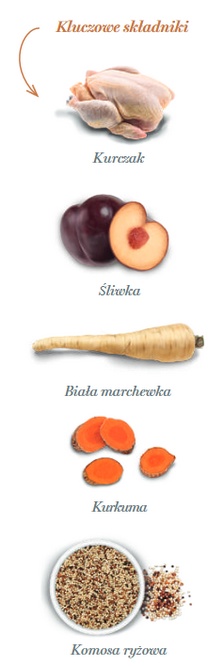Świeżo przygotowany kurczak 70% (używamy 140 kg świeżo przygotowanego kurczaka do wytworzenia 100 kg naszego produktu), brązowy ryż, cały zielony groszek, hydrolizat wątroby kurczaka, drożdże (Saccharomyces cerevisiae), białko ziemniaczane, błonnik jabłkowy, minerały, olej rybny (chroniony naturalnymi tokoferolami), glukozamina 1400 mg/kg, odwodniona dynia, komosa ryżowa 1000 mg/kg, odwodnione brokuły, odwodniony jarmuż, kryl antarktyczny, wodorosty kelp, żurawina, spirulina, biała marchew 1 000 mg/kg, odwodnione śliwki 1 000 mg/kg, cykoria (źródło FOS) 1 000 mg/kg, hydrolizowana ściana komórkowa drożdży (źródło MOS) 1 000 mg/kg, chondroityna 1 000 mg/kg, kurkuma