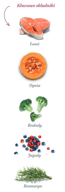 Świeżo przygotowany łosoś 71% (używamy 125 kg świeżo przygotowanego łososia do wytworzenia 100 kg naszego produktu), cały zielony groszek, odwodniony ziemniak, białko grochu, hydrolizat łososia, drożdże (Saccharomyces cerevisiae), minerały, błonnik jabłkowy, nasiona lnu (naturalne źródło kwasów tłuszczowych 3), olej rybny (chroniony naturalnymi tokoferolami), słodki ziemniak, tapioka, glukozamina 1,400 mg/kg, odwodniony jarmuż kryl antarktyczny,