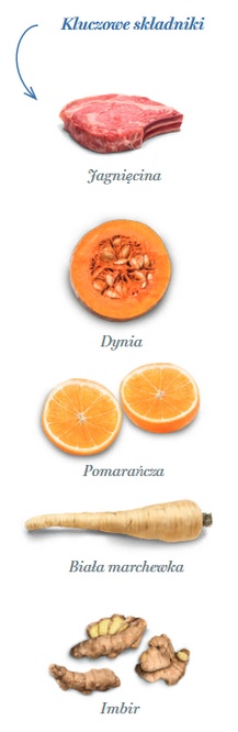 Świeżo przygotowana jagnięcina 65% (używamy 127 kg świeżo przygotowanej jagnięciny do wyprodukowania 100 kg naszego produktu), odwodniony ziemniak, cały zielony groszek, błonnik jabłkowy, olej z kurczaka (chroniony naturalnymi tokoferolami), hydrolizat wątroby jagnięcej, minerały, drożdże (Saccharomyces cerevisiae), nasiona lnu (naturalne źródło kwasów tłuszczowych omega 3), olej rybny (chroniony naturalnymi tokoferolami), glukozamina 1,400 mg/kg, odwodniona dynia 1,000 mg/kg, odwodnione brokuły, odwodniony jarmuż, kryl antarktyczny, wodorosty kelp, żurawina, spirulina, imbir 1,000 mg/kg, biała marchew 1, 1,000 mg/kg, cykoria (źródło FOS) 1,000 mg/kg, hydrolizowana ściana komórkowa drożdży (źródło MOS) 1,000 mg/kg, chondroityna 1,000 mg/kg, odwodniona pomarańcza 500 mg/kg, rozmaryn, yucca schidigera.