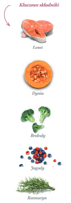 Świeżo przygotowany łosoś 70% (używamy 122 kg swieżo przygotowanego łososia do wytworzenia 100 kg naszego produktu), cały zielony groszek, odwodniony ziemniak, białko ziemniaczane, hydrolizat łososia, drożdże (Saccharomyces cerevisiae), błonnik jabłkowy, nasiona lnu (naturalne źródło kwasów tłuszczowych Omega3), minerały, słodki ziemniak, tapioka, olej rybny (chroniony naturalnymi tokoferolami), glukozamina 1 400 mg/kg, odwodniony jarmuż, kryl antarktyczny, wodorosty kelp, spirulina, cykoria (źródło FOS) 1 000 mg/kg, hydrolizowana sciana komórkowa drożdży (źródło MOS) 1 000 mg/kg, chondroityna 1,000 mg/kg, odwodniona dynia 1,000 mg/kg, odwodnione brokuły 1,000 mg/kg, żurawina 1,000 mg/kg, jagody 1,000 mg/kg, rozmaryn 250 mg/kg, yucca schidigera.
