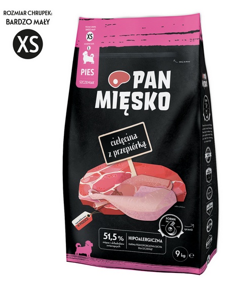 Pan Mięsko Karma sucha dla szczeniąt - cielęcina i przepiórka chrupki XS 9kg kup w sklepe internetowym Zoo-mall.pl już teraz.