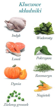 świeży indyk 35%, świeży łosoś 30%, dynia 2,5%, zielony groszek 2,5%, minerały, siemię lniane 0,03%, glukozamina 300 mg/kg, inulina (źródło FOS) 0,02%, hydrolizowana ściana komórkowa drożdży (źródło MOS) 0,02%, chondroityna 215 mg/kg, wodorosty morskie, pokrzywa 100 mg/kg, rozmaryn, nagietek 100 mg/kg.