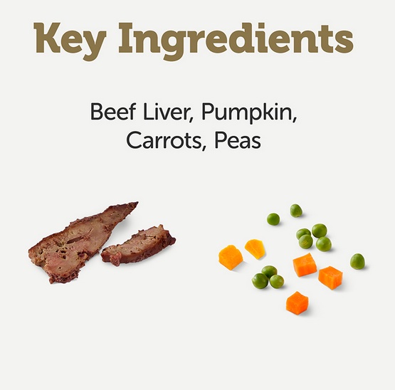 Pierś z kurczaka 28%, bulion z kurczaka, wątroba wołowa 18%, dynia 8%, marchewka 8%, groszek 8%, ryż
