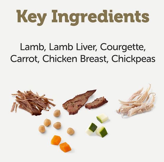 Bulion jagnięcy, jagnięcina 26%, marchew 10%, cukinia 10%, pierś z kurczaka, ciecierzyca 5%, roślinna substancja żelująca.