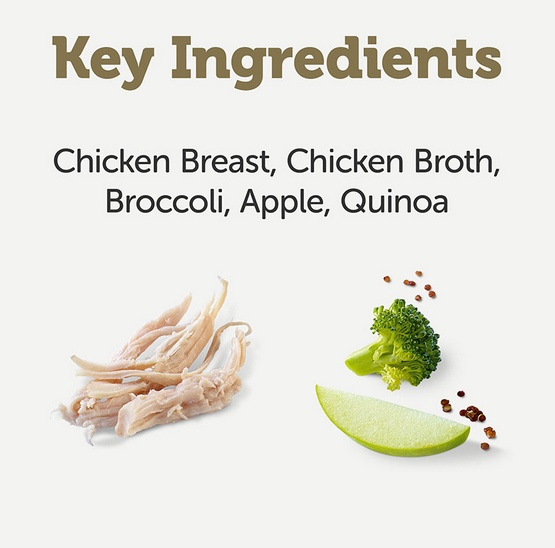 Pierś z kurczaka 45%, bulion drobiowy, brokuł 10%, jabłko 10%, kosma ryżowa 5%, skrobia ziemniaczana.