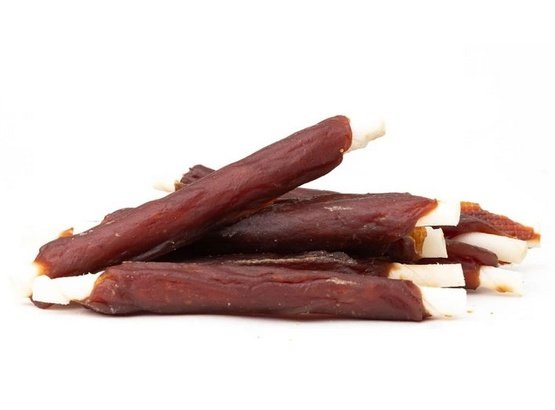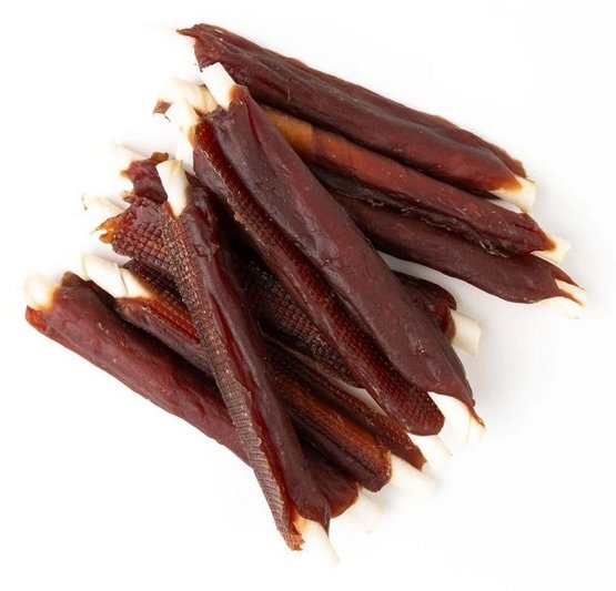 Główne składniki: Mięso kaczki, skóra wołowa. Te smakołyki łączą w sobie wartości odżywcze dostarczane przez mięso kaczki – źródło wysokiej jakości białka i zdrowych tłuszczów – z korzyściami płynącymi z żucia skóry bydlęcej, co wspomaga czyszczenie zębów u psów.