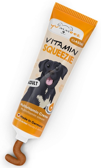 Pasta Yummeez Classic Squeezie Adult charakteryzuje się bogatym składem, który jest specjalnie opracowany z myślą o dorosłych psach. Zawiera niezbędne witaminy i minerały wspierające zdrowie i witalność Twojego pupila.