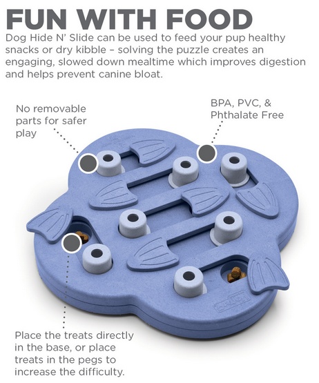 Sposób użycia: Gra edukacyjna Hide 'N Slide Purple, poziom 2, przeznaczona jest dla psów, które już zaznajomiły się z podstawowymi zabawkami interaktywnymi. Aby rozpocząć zabawę, umieść smakołyki w przegródkach zabawki i zachęć swojego psa do samodzielnego odkrywania ich poprzez przesuwanie i obracanie elementów. W początkowej fazie zabawy warto pokazać psu, jak działa mechanizm, aby jeszcze bardziej go zainteresować.