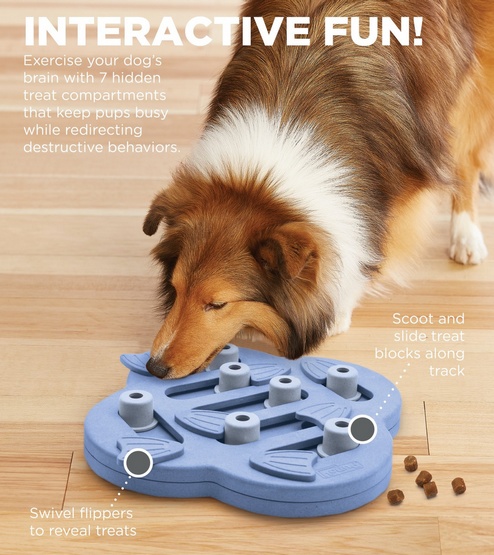 Nina Ottosson Hide 'N Slide Purple to gra zaprojektowana z myślą o stymulacji intelektualnej psów. Wykonana z wytrzymałego, drewnopodobnego tworzywa kompozytowego, oferuje dwupoziomowe wyzwanie, które wciągnie Twojego psa w zabawę. Zadaniem psa jest przesuwanie elementów, aby dostać się do ukrytych smakołyków. Dzięki temu, zabawka nie tylko bawi, ale i uczy, rozwijając zmysł węchu oraz umiejętności manualne czworonoga.