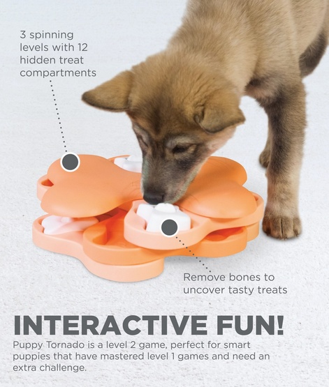Tornado Pink Puppy to gra o poziomie trudności 2, co oznacza, że stanowi doskonałe wyzwanie dla młodych psów. Zestaw składa się z kilku poziomych przegródek, które można obracać, aby odkrywać smakołyki. Wystarczy napełnić je ulubionymi przysmakami lub suchą karmą, a następnie zachęcić pupila do odkrywania ich poprzez zabawę. Tego rodzaju aktywność nie tylko zapewnia rozrywkę, ale także pomaga w budowaniu więzi między pupilem a jego właścicielem.