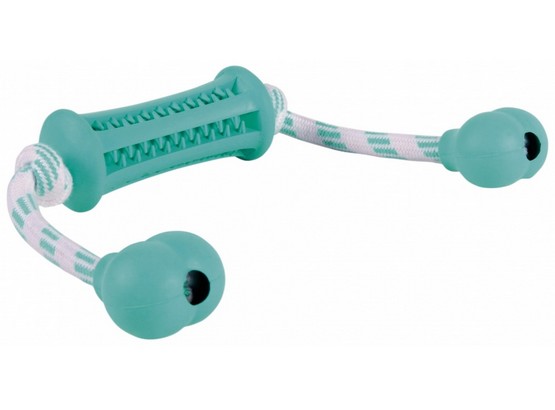 Zabawka posiada miętowy zapach, który dodatkowo zachęca do zabawy i odświeża oddech Twojego pupila. Dwie bawełniane linki, zakończone kulkami, umożliwiają właścicielom zabawę w przeciąganie, co wspiera wzmacnianie więzi między psem a opiekunem oraz rozwija jego zdolności motoryczne.