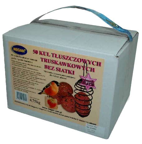 Karma pełnoporcjowa dla ptaków w postaci kul tłuszczowych.
